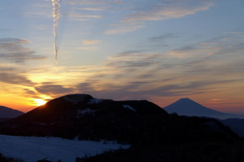 そういうふうに気が変わったので、午前5時には小屋を発つことができるよう、テキパキと支度を進める。富士山も姿を現してきた。素晴らしい黎明が訪れようとしている。感動の夜明けを待って小屋を出る。静高平から三吉平までの急斜面には雪がびっしりと付いているが、ノーアイゼンで滑りながらもどんどんと降りて行く。