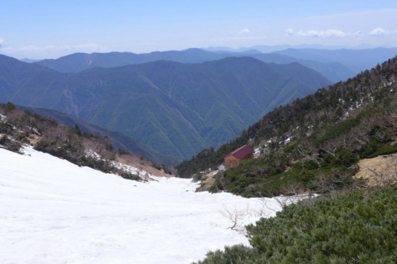 茶臼小屋に着いて、下山の前に小腹を満たし出発の準備を整えようとしたとき、聖岳方向からヘリコプターが飛んできて小屋の上を通過する。ほどなくまた小屋に向けて旋回してくる。遭難者の捜索なのか。背を向けていると彼方に飛んでいった。