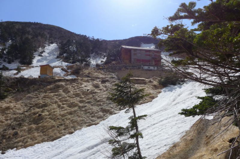 これはいけないと先を急ぐが、時期に登山道は雪に覆われるようになってきて、足を取られるようになる。1人が下りてきて「光岳に行くのなら雪があって間違いやすいから気を付けて」と注意してくれる。その前に樺段あたりから茶臼小屋までのことを心配しなければならない。昨年はここで難渋した。今年は雪が少ないからそれほどでもなかったが、雪の重みで木々が寝ていて夏道を塞いでいる上に、テープ類はほとんど付けられていないことから、どのようにルートを採るかを試される。昨年の経験が生きそれほどストレスなく茶臼小屋に着くことができた。外階段を上がっていくと2重の戸は締まっている。