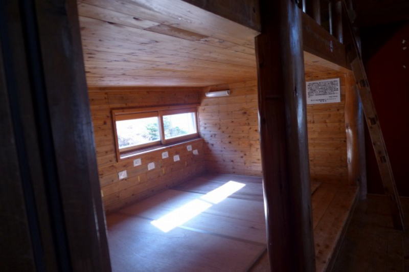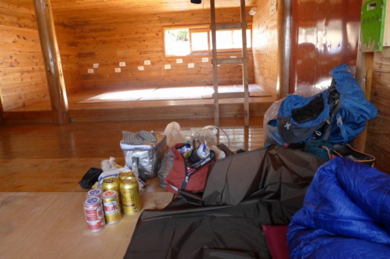 この連休中に冬季小屋の外窓は開放されたとみえ、明るい陽射しが小屋の中を明るくしている。小屋裏の山側から流れ出た水がホースで導かれている。ビールと日本酒を水で冷やしているうちにシュラフを敷き食事の用意を整える。