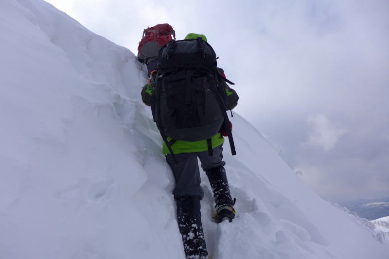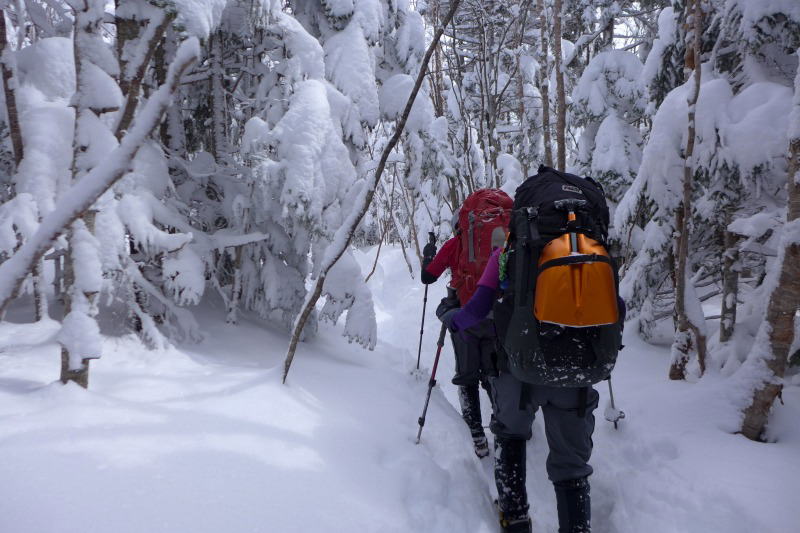 渋の湯からの取付きはすぐに、新雪で覆われた急斜面となる。しかし、トレースはしっかりしているし特にアイゼン等を必要とするところ(状況)ではない。鬱蒼とした暗い樹林帯を淡々と登るとパノラマコースの尾根に乗る。少し明るくなった樹林帯をさらに進むと、急にポッと視界が広がり、黒百合平に出て黒百合ヒュッテが待ち受けている。と言っても、テント泊なので小屋への用事は幕営料(一人1,000円)の支払いと、小屋のトイレの使用だけではあるが。なお、黒百合ヒュッテのトイレは、テント泊の者も小屋内のトイレを使うことになっている。トイレは暖かく、広く、そしてきれいである。