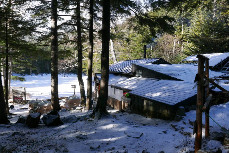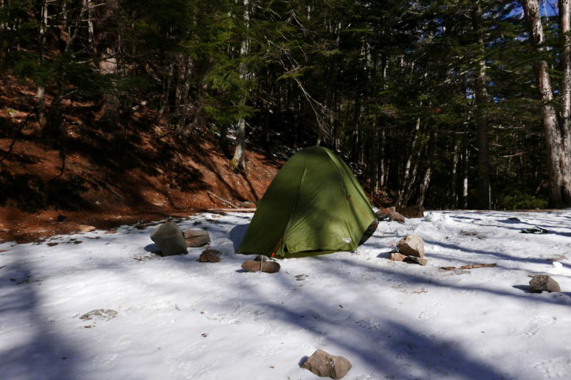 本沢温泉のテント場は、秋口にちょっと雪が降りましたといった風情で、圧雪など全く必要なく、夏場のような感じでテントを張る。テントの設営を終えるとザックを身軽にし、温泉の帳場で受付を済ませてから夏沢峠へと向かう。