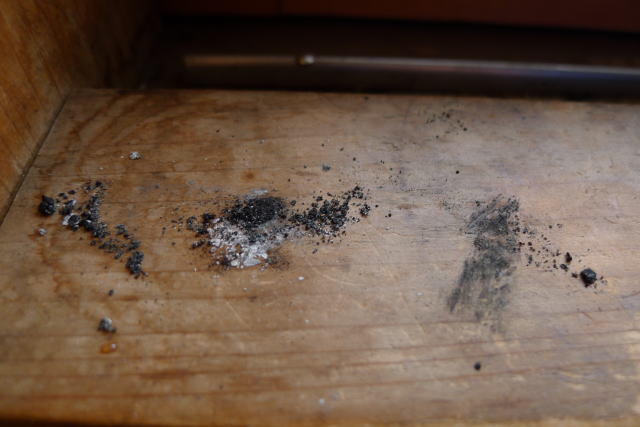 同じ日の酉谷山避難小屋の内部、窓辺の桟である。