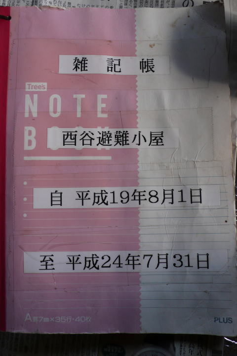 以前のノートは「雑記帳」と記された公用の消耗品が置かれていたとの認識であるが、「酉谷山避難小屋ノート」というタイト ルは、登山者が付けておいたものであるから、都レンジャーが持ち去ったとは考えにくい。しかし、わざわざノートのすべてを 持ち去る必要性、合理性は一般の登山者にはないはずである。