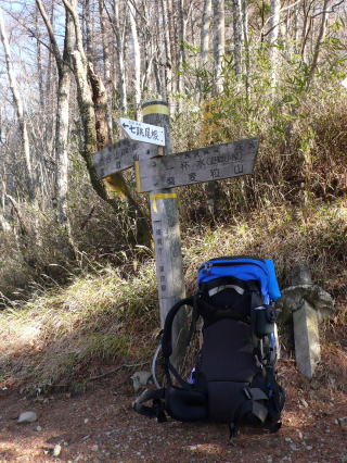 酉谷山から七跳山までのアップダウンの少ない尾根道をゆっくり、ゆっくりと歩く。富士山が見える周回路だ。予定より2時間遅く下山するので時間があるから、七跳の分岐でしっかり休む。分岐からは急斜面に建てられている酉谷避難小屋がよく見える。