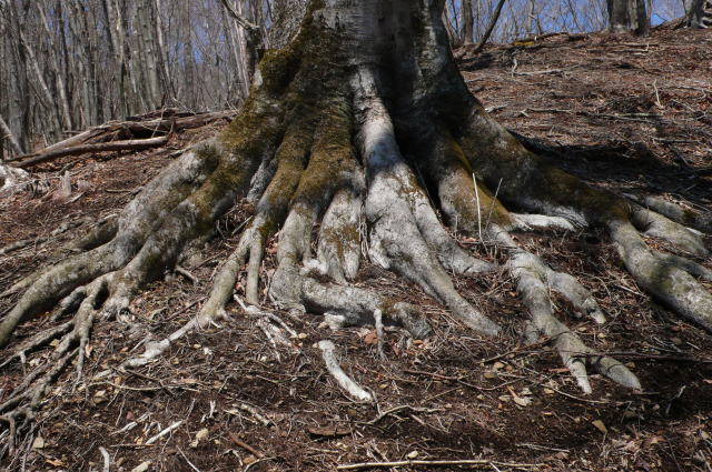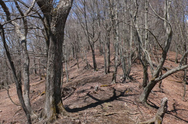 一石山手前で日原からのルートが合流する。よく踏まれていて、歩く人が多そうだ。その分岐からすぐ先に一石山の標識(手製)がある。一石山から自然林の中、ゆっくりとした傾斜を登る。蕾のスミレが多い。そのうちにミズナラの巨木が現われる。巨木は尾根の南西面にあり、尾根に乗って北に向かうと人形山である。快適な自然林の尾根を歩くと右手の小川谷林道から上ってくる道が合流する。男性が地図を見ながらその道を登ってくる。篶(すず)坂ノ丸の登りで追い着かれ追い越される。上からは大学生のグループが元気に下りてくる。雲取小屋から来たという。まだ昼前なのに、やはり若さだなぁ。