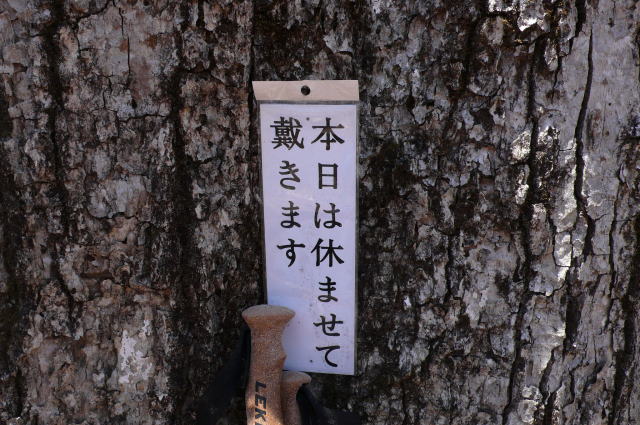 ウトウノ頭に着くと、追い越したおじさんが昼食中だ。ここには手彫りのカラフルな山頂標識があったはずなのに、ない。今回の楽しみの一つだったのでがっかり。ウトウノ頭北側の凍った急斜面を下り、次の日あたりのいいピークで昼食とする。