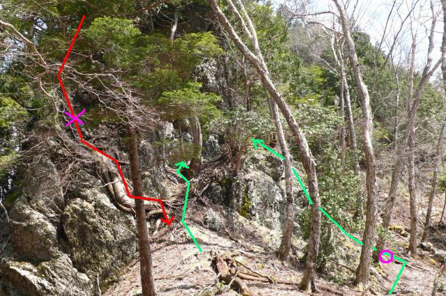 次に進むと岩に「×」印が赤ペンキで描かれている。ならばと踏み跡のある小川谷林道側を下りるが、イワカガミやシャクナゲが生えている細い踏み跡は、3mほどの垂直な岩場になる。ここを落ちれば3m下の靴幅2つ分の場所から谷に落ちてしまうので、緊張する。無事に下りて少し歩き、また垂直の壁、そして最後の急傾斜の岩場でコルに着くが、ここが今回の唯一の難関であった。コルに出てみれば何のことはない、×印が描かれた岩の左、孫惣谷側を巻けばいいことであった。