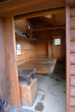 一杯水のすぐ先にある一杯水避難小屋で昼食のための休憩とする。ドアを開けると外のガスが小屋の中に流れて入ってくる。ストーブや私物の布団・マットなどが撤去された小屋は内部はすっきりとしていて気持ちがいい。外壁もペンキが塗り替えられている。