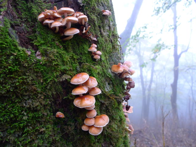 4日前に寄ったときに、この小屋には寝具等はなかった。しかし、奇特な人がいるものだ。汚れた敷布団1枚が持ち込まれていた。しっかり休憩できたので、小屋前からヨコスズ尾根を下りる。この尾根も自然林で覆われている。天気がいい日ならもっともっと快適な歩きになったろうに。