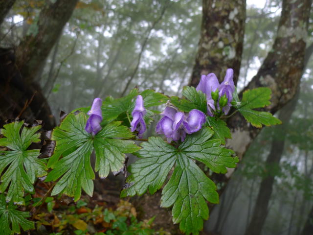 長沢背稜には、時おり風が吹き付けてくる。合羽を着込み、ツバ広の帽子で雨風を防ぐ。雨に濡れた登山道を進むとリンドウが1輪咲いている。七跳山を巻いて黙々歩く。飽きたころに一杯水避難小屋にポッと出る。もう2時間も歩いたから一休みとする。