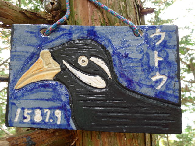 金袋山付近で籠を背負った地元の方に出会う。この時期の山の幸を手にも一杯下げている。篶坂ノ丸(すずさかのまる)を過ぎウトウノ頭に着くとユニークな陶板製の山頂標識が掛けられている。前回来たときには彫刻の彩色された標識が盗まれて仮の標識だった。恥を知らない不心得者がいる一方、このように心を込めてくれる人もいる。