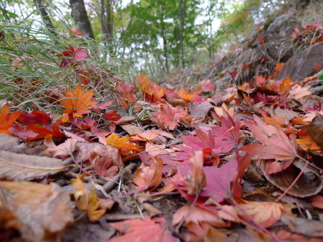 登山道に降り積もった落ち葉を踏みしめ、静かな長沢背稜歩きを楽しむ。春に崩壊していた急斜面の危険な登山道は綺麗に石積みされ、コンクリートで補強されている。「コンクリートから人へ」とはよくも言ったものだ。だが、コンクリートの恩恵を誰もが受けている。よくぞこのような山奥に砕石を運び、コンクリートを練って、崩壊した登山道を整備してくれたものだ。これぞ「人のためのコンクリート」である。予定通りの時間をキープしながら歩いている。ガスが濃く酉谷山をパスしたいが、時間が早いのでとりあえず頂上に立つ。