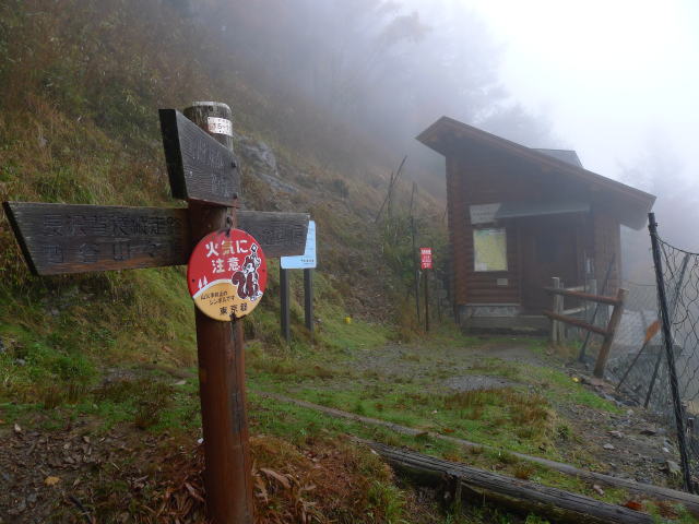 旧酉谷小屋からは岩混じりの登山道となって、斜度も増してくる。さらに高度を上げるとカラマツと笹の斜面になって我慢しながらジグを切ると、ひょっと酉谷山避難小屋が顔を出す。雨に霞んだ小屋にひと気はない。小屋に入って濡れた下着を替えて保温を図る。今回の小屋訪問の目的は、コーヒーを淹れたりしながら昼の時間をのんびり過ごすことにあった。あまりにものんびりし過ぎて、2時間近くも滞留してしまった。小屋の土間を綺麗にして辞する。