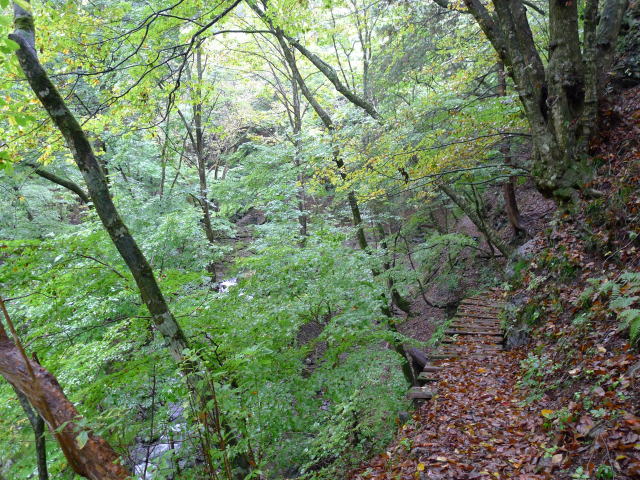 ところが、日原鍾乳洞から小川谷林道沿いにも、七跳尾根取り付きからの小川谷沿いにも植林は見当たらず、自然林ばかりであった。そして、木々の立派さといったら、タワ尾根に引けをとらないどころか、かえって小川谷のほうが巨樹が多いと感じられた。あいにく雨で足場は悪いが、三又まで歩く。