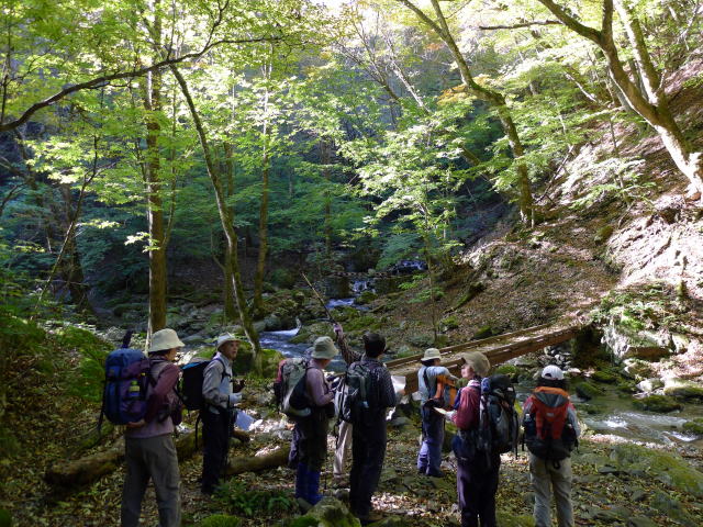 三又までくれば、もうリスクのある場所は少なくなる。あとは、あまたある巨樹と紅葉、渓流美を楽しむだけだ。三又から急なジグを切る登山道になる。グループの後を行くが、このグループは急に登山道を離れ支尾根を軽々と登っていく。そう言えば、何人かはいろいろ書き込みのある国土地理院の地図を持っていたことから、独自のバリエーションルートを歩き、滝谷ノ峰と行者ノタオの中間にでも出るのだろうか。