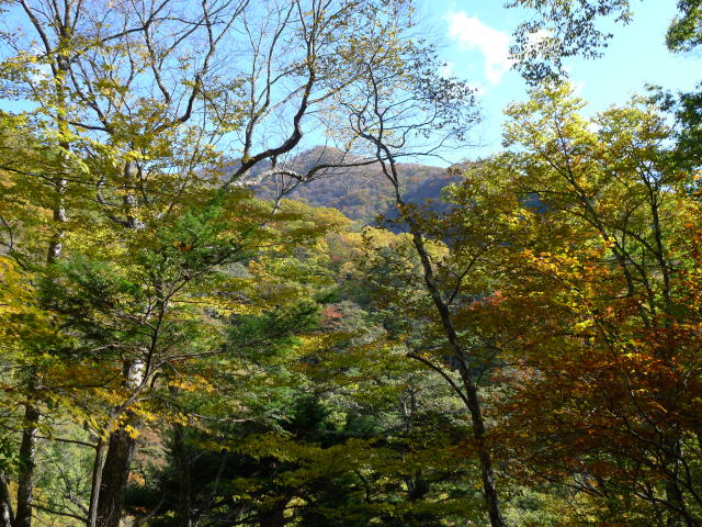 あまりの快適さに長居し過ぎた。そろそろお別れをしなければ・・・。 小屋から長沢背稜に出て七跳山への快適な道を歩く。もう、木々は葉を落としているが、樹林の隙間から見える山の中腹は真っ赤に燃えている。