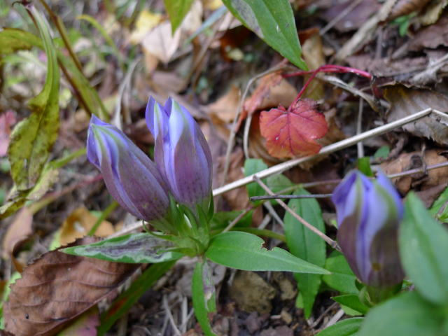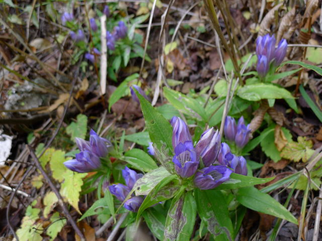 途中、思いも寄らないオヤマリンドウの群れに出会い、七跳尾根を下る。もう間もなく小川谷にも太陽が差し込まなくなるという時間だったので、林道終点の土場で着替え中に下りてきた単独氏に同乗を勧め、駐車場のある鍾乳洞に向かう。登山者を満載したバスの後を追いながら奥多摩駅に向かうと、その先は青梅街道も新青梅街道も断続的に車の数珠繋ぎで、結局100kmほどの距離に5時間近くもかかってしまい、休日の山登りのもう一つの困難さを実感した。