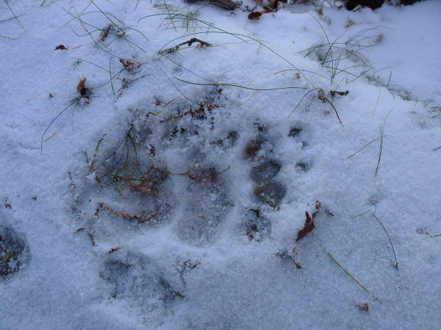 小屋の掃除を済ませ小屋を後にする。小動物のかわいい足跡が雪の上にある。長沢背稜に出る。白く染まった登山道に鹿の足跡がある。と・・・、急に大きな足跡が雪の上に付けられている。秩父側から長沢背稜に出てきて登山道を少し歩き、小川谷に下りていったツキノワグマの足跡だった。
