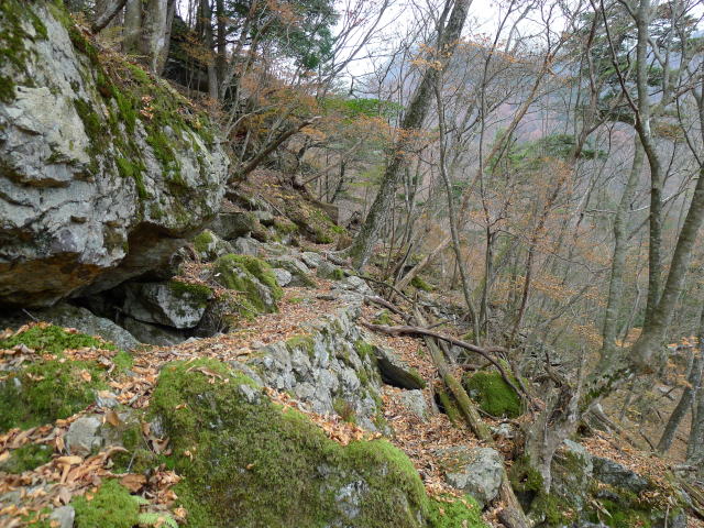 「今、奥多摩・東日原からの山が面白い」というマイブームの続きで、上段歩道を歩いてみることにした。東日原の駐車場に車を停めて日原鍾乳洞の先に向かう。この日狩猟が解禁になったとのことで、ハンターから「気を付けて下さい。」と注意される。賀郎橋の手前のモノレールの軌道始点が登り口となる。この上段歩道は踏み後程度のところと思っていたが、しっかりした山道がどこまでも続いていた。