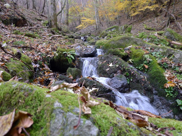 材木尾根を越え四間小屋尾根への道を進む。深山幽谷とはここのことを言うのだろうか。小川谷やタワ尾根とはまた趣のまったく違う場所である。鳥居谷右俣の流れを渡って四間小屋尾根の南斜面をトラバース気味に傾斜を上げると、四間小屋尾根の屈折点に着く。しかし、ここがその尾根だという標識の類は一切ない。林班界標奥多摩分区「25|26」という東京都水道局の標識がその尾根の位置の判別になる。(この標識をさらに進むとウトウの頭からの顕著な踏み跡があるので、訂正します。そしてその踏み跡をそのまま下ると、最終的には小川谷/三又に出ます。H24/11/30)
