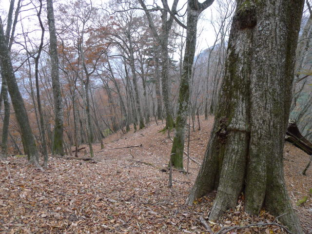 その境界標識から尾根を辿る。尾根は当初カラマツの植林帯で、切り倒された木が横たわるが、そのうちに自然林に変わる。尾根を忠実に登っていくと巨樹・巨木が目立ち、さらに登っていくと左から支尾根が突き上げてきて合流する。合流部分でいったん平坦気味になるが、そこで尾根は少し左に折れ、ウトウノ頭へと続いている。次第に傾斜が急になるころ、それまで不明確であった踏み跡が急に明瞭になる。それは傾斜が急で落ち葉が溜まることがないからかもしれない。我慢しながら登るとウトウノ頭に出る。