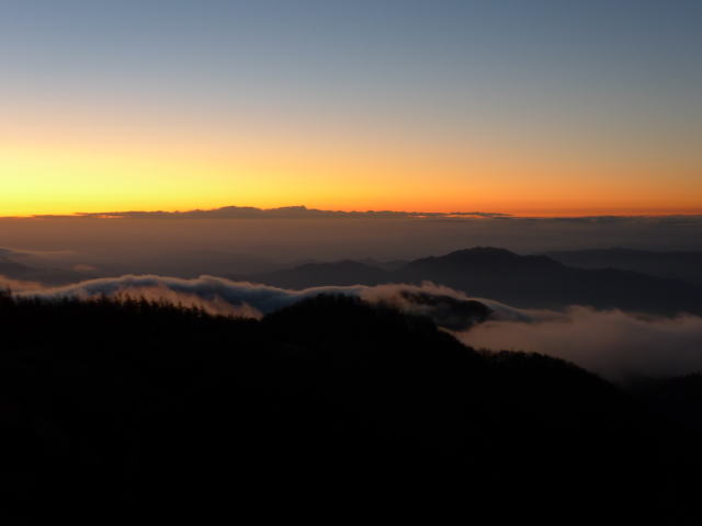 午前4時半、まだ誰も起きない。今日(2日)の行程は酉谷山までなのでゆっくりと起きて、ゆっくり長沢背稜歩きを楽しむ予定であったが、天気予報は3日未明から風速20mの風雨になることを伝えている。今日中に東日原に下りることも考慮し、6時までに出立することにする。小屋の外に出てみると美しい朝焼けで、ガスがもくもくと沸き立って尾根を越えてきている。