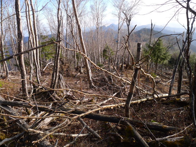 雲取ヒュッテという名ばかりの放置され廃屋となった小屋を過ぎ、大ダワに出る。しばらく行って秩父・三峰方面と分かれ、芋ノ木ドッケへの斜面に取付く。そう言えば2002年の暮れにここを登ったときは雪が多かったななどと当時を思い返すが、それ以外の記憶は戻ってこない。