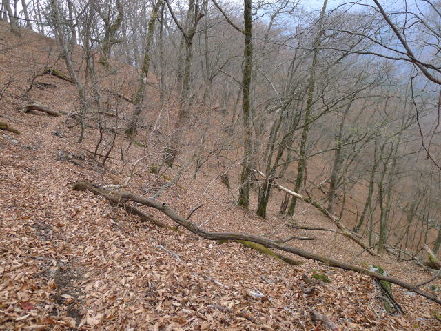 一杯水避難小屋前で少し腹ごしらえをし、ヨコスズ尾根を下る。急いで尾根を下りていたから落ち葉に隠れた登山道の木の根や石に木を使い足元を見ていた。小屋から20分ほど下りたとき、登山道左手の斜面からザワザワと音がする。落石かな、鹿かなと思って顔を上げると、登山道右手斜面を大きな岩が転がっていく。倒木の手前で急に岩が止まった。そして岩がこちらを振り向いた。耳がある、顔がある。ツキノワグマだった。ツキノワグマは再び落石が斜面を転がるようにして谷に向かって駆け下りていった。
