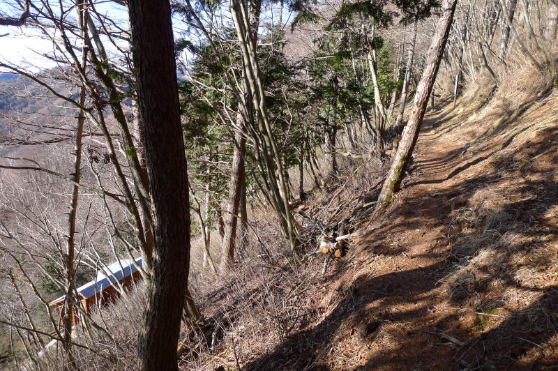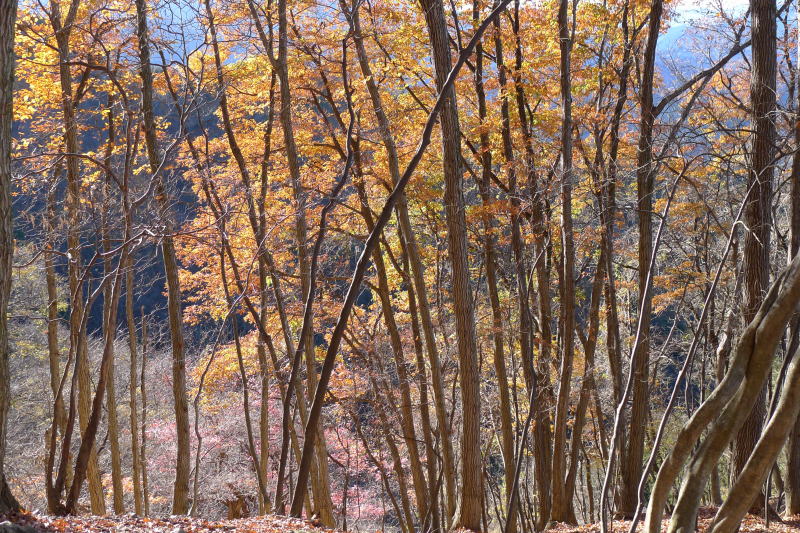 ・・・と、大きな口を利きましたが、標高700mの尾根で一度道を失ってしまいました。というのも、その尾根が登りのときに感じた傾斜よりあまりにも急だったことや、登山道のたっぷりと落ち葉が堆積していて曲がって下りるべきところを、勘違いしてしっかりした踏み跡をそのまま進んでしまったのです。ただ、だんだんと踏み跡がなくなって武州中川駅方面から離れたので元に戻ると、本来の道は尾根を急降下すればよかったのでした。
