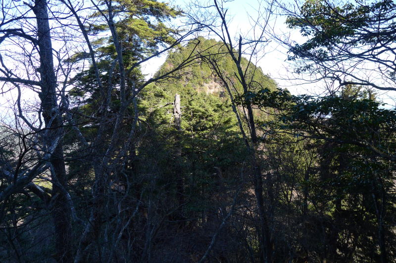 特に長沢背稜の高みから見た立橋山の急峻さは抜きんでいたものの一つです。画像を見ると手前の樹木が邪魔をして山の全容はお見せできませんが、なかなかの迫力です。この山の南面はごつごつした岩場になっているので、丁寧に足場を確認して登り切ります。