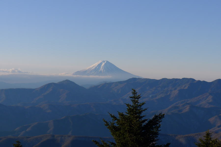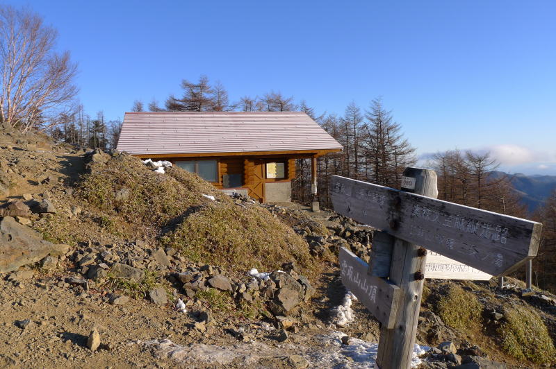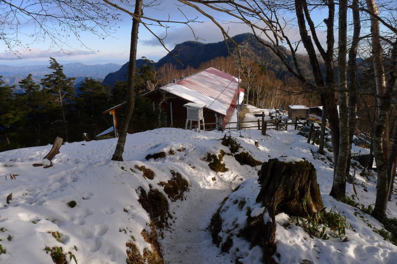 今年の雲取山には日陰を除き雪がほとんどありませんが、雪がない分気温は確実に下がっています。指先を出したままいったん外に出るとたちまちのうちに手がしびれてきます。太陽が上がってからもうしばらく時間が経っていますが、それでもマイナス13度です。出発の準備をしていると、まだ午前7時過ぎだと言うのに(たぶん雲取山荘から来たのでしょう)登山者が到着して小屋の外のベンチに座って景色を眺め、出発して行きます。
