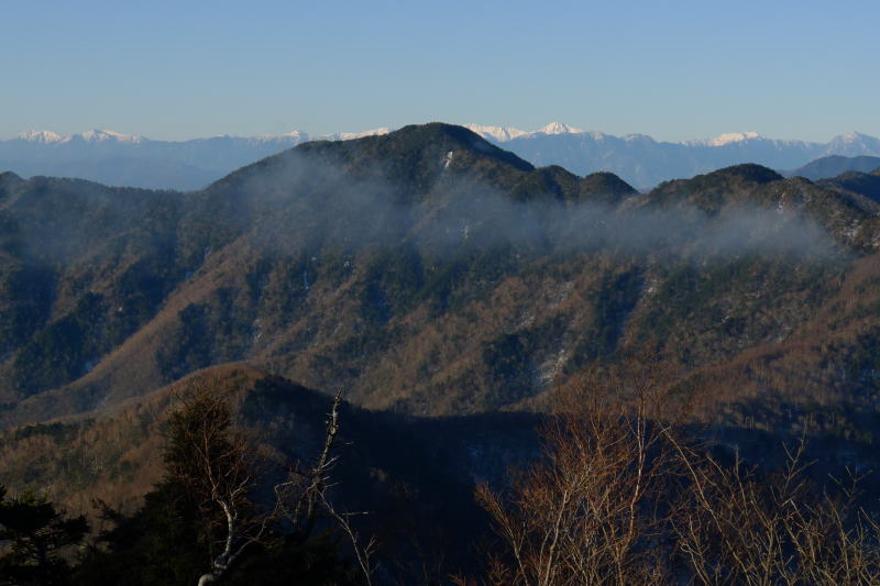 桂谷ノ頭から長沢背稜の核心部の稜線岩稜部を過ぎて一安心し、柔らかな広葉樹林斜面で昼食を摂ろうと考えながら歩いていると、前方斜面を黒い動物が駆け上がっていきます。ツキノワグマにしては細身であり、首輪が見えたので、コンマ0秒でそれが猟犬だと分かったのです。今は狩猟の時期で、谷底からは動物を追い上げる猟師の声が聞こえてきます。本来なら鹿は雪のある凍った稜線で餌を摂るより標高の低いところにいた方がよさそうです。それが人の多い雲取山頂上周辺や雲取山荘周辺に屯しているということは、そこでは銃口は向けられないと知ってのことなのでしょう。