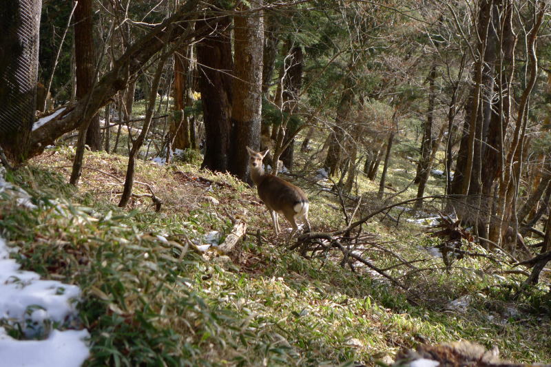 大ダワからは陽だまりを歩きます。登山道脇に鹿が群れていますが、近づくと少し離れる程度です。こちらをちらちらと見ながら地面をつついている姿を見ると、登山者は敵ではないことを知っているように感じます。登山道に斜度が付き山の北側を巻きながら高度を上げていきます。芋ノ木ドッケと白岩小屋の分岐点から、急に踏み跡の少なくなった芋ノ木ドッケ方向へと向かいます。