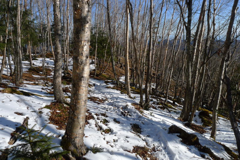 ガチガチに踏み固められた鴨沢から雲取山の登山道、北側斜面だから歩く人は少ないだろうと思った雲取山から三峰口へ下りる芋ノ木ドッケ分岐までのツルツルではあるが歩道のような登山道から離れ、落ち葉でフカフカの斜面を登り芋ノ木ドッケに着きます。そこから少し進むと長沢背稜と白岩小屋へと別れる倒木帯のポイントに出ます。進路を右に取ると稜線は若木の疎林となって太陽の光を一杯、ぜいたくに浴びることができます。