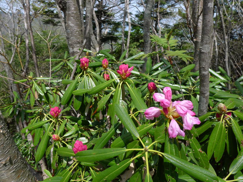 そう思いながら先に進むと、これまでのうっそうとした日陰とは違って開けた場所でアズマシャクナゲがまさに花開こうとしているのでした。あまりにも清々しい風景に思わず声を上げてしまいました。こんなわずかなことなんですが、山を歩いて辛いと思っているときにはたまらなくうれしいときです。その後は疲れもすっかり吹き飛んでしまっていたのでした。