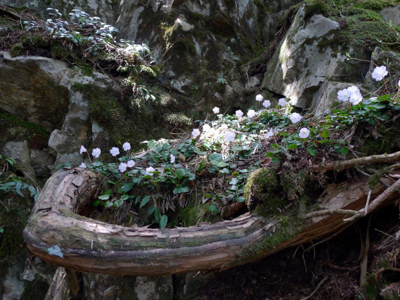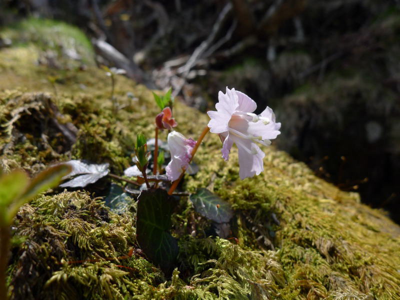この先に岩場があってアズマシャクナゲとともにイワウチワもあるはずだがと思っていたら、そのとおり、清楚なイワウチワがあちこちに咲いました。イワウチワと言うだけあって、どれも岩場かその近くに咲いているのですが、中には天の邪鬼(個性豊か)なイワウチワもあって、倒木の上で花を咲かせています。