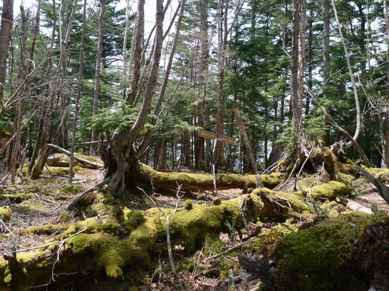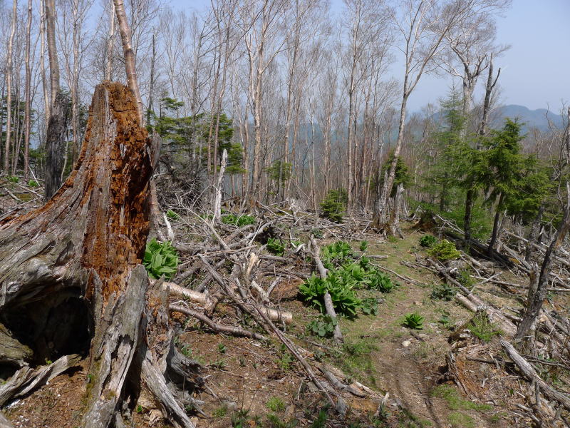 長沢背稜は新緑が始まったばかりです。ヤマザクラは葉桜になろうとしています。もう温度計は20℃を超えていて、今日も暑くなりそうです。昨日の直登が足腰に来て、文字通り鉛のようになった体を我慢しながら前へと進めます。すると、まだ9時前だというのに水松山のずいぶん手前で酉谷山方向から来た単独女性と交差します。さらに進んで長沢山へもう少しというところで大休止を取っていると天祖山から登ってきたという男性が通り過ぎていきます。