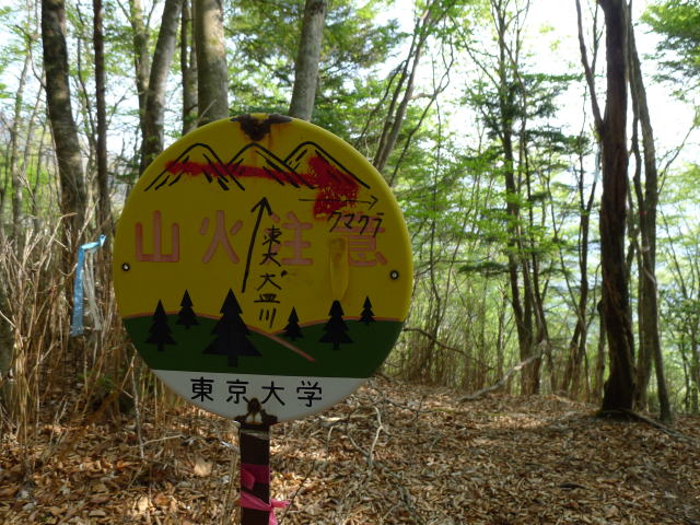 この植林帯が切れると尾根筋のスズタケの中を登っていくことになります。いったんゆるい傾斜を登りますが、熊倉山からの尾根道はもう少し先になります。熊倉山からの尾根道との合流点には、東京大学の「山火注意」の看板があります。各種テープとともに下山時の目印となります。ここから緩斜面を小黒方向に向かい、途中倒木などがあるところで直登する踏み跡と、本来の道と思われるトラバース状の道に分かれます。なぜ「本来の」と言うかというと、トラバース道の先に酉谷山への道を示す古い道標が立てられているからなのです。