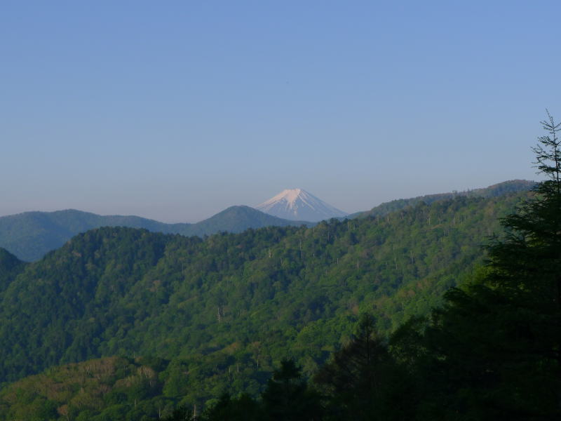 ザックの軽量化を図り衣類も必要最小限にした結果、昨日の夕方は少し寒い思いをしました。いくら初夏でも標高1,700mの夕方は冷え込みます。そんなわけで、早々にシュラフに潜り込んで熟睡したから目が覚めるのも早く、午前2時ごろでした。ラジオ深夜便を聞きながらまどろみ、午前5時前に起きて支度をします。小屋の窓からは富士山が見え、なんとも清々しい朝を迎えました。