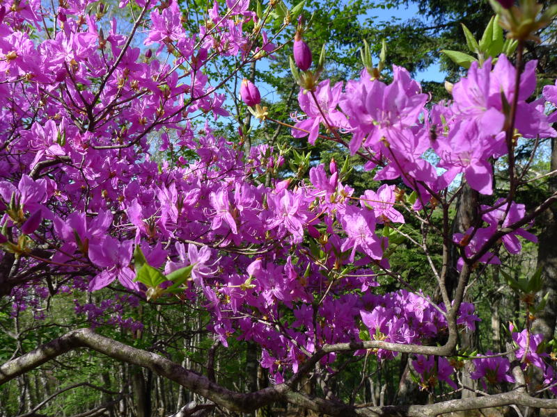 今回の山登りで期待していたアズマシャクナゲの場所は前日の赤岩ノ頭でした。期待に違わず可憐な花が見られましたが、それはほんの数株だったので、先の女性グループの話を楽しみに桂谷ノ頭に着いてみると、そこはシャクナゲロードだったのです。たとえば甲武信ヶ岳のシャクナゲの大群落を知っている人からすればちゃちなところかもしれませんが、ここのシャクナゲで十分満足です。