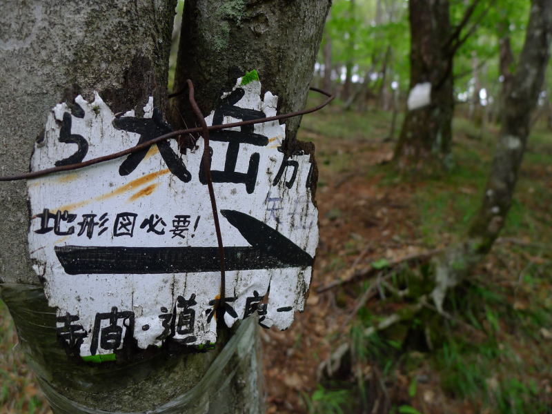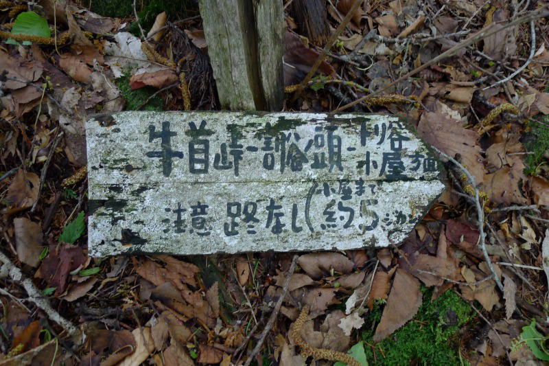 赤岩ノ頭の手前の分岐(荒川地区へ下りる)には古い道標が置かれています。この道標を見ると「牛首峠〜割谷ノ頭(坊主山)〜トリ谷山方面 注意:路なし(小屋まで約5ジカン)」と書かれていますが、この標識の言うトリ谷小屋は「旧酉谷小屋」のことだと思われます。その当時は本当に難路であったのでしょう。今でも山地図上の所要時間は4時間程度と見積もることができます。