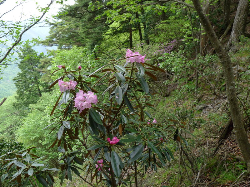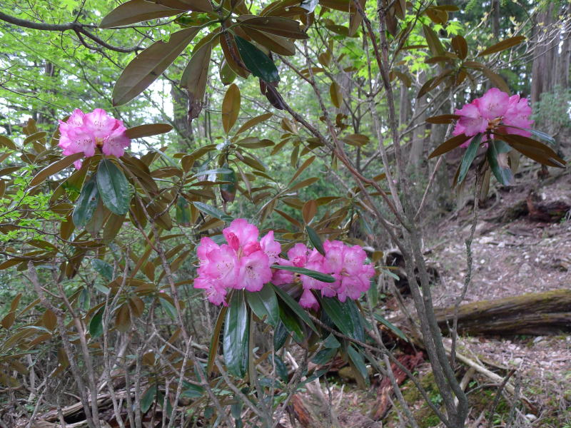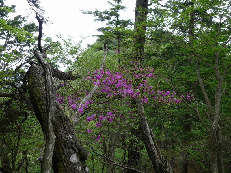 さて、目的の花のアズマシャクナゲですが、赤岩ノ頭ではまだ標高が低いからか花付きがよくなく、ほんの数株咲いているだけでした。それでも、この稜線で初めて見たシャクナゲの花なので、喜びはひとしおでした。ここまでの間、ミツバツツジも多く咲いてはいましたが、赤岩ノ頭を過ぎて稜線が特にゴツゴツしてくるとツツジの本格的な出番です。