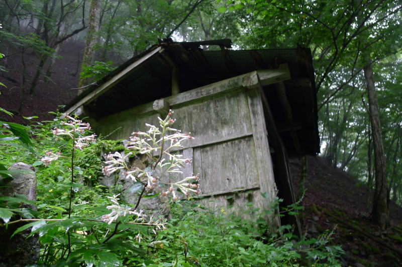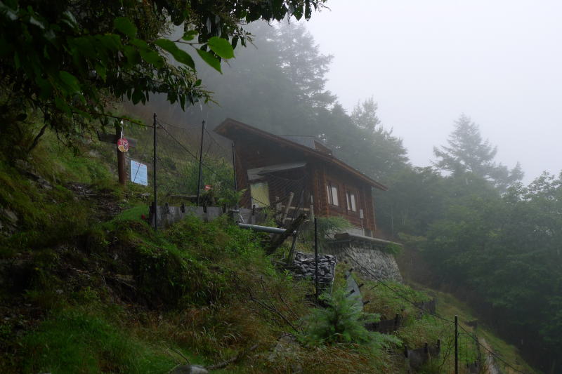 雨は小降りとなってきましたが、ガスが立ち込めています。今回三又まで下りた理由の一つが、三又から酉谷山避難小屋までの間にある手付かずの自然林の中を歩くということでした。ただ、素晴らしい風景を抒情的に眺めるというより、雨で滑り易い岩やゴロゴロした石に足を取られて転倒しないようにピリピリしながら歩いたというのが実際でした。そのためにほとんど休むことなく酉谷山避難小屋下の植林帯に入ったので、小屋はもうすぐの距離となりました。今回は普段は持たない着替えのズボンをザックに詰めてきました。さあ,小屋だ、着替えてさっぱりするぞ、と小屋を見やると、小屋の窓にプラティパス(水筒)が置かれているのが見えます。おかしいな〜、こんな天気に酔狂な人はいないはずなのにと小屋に近づくと・・・・。