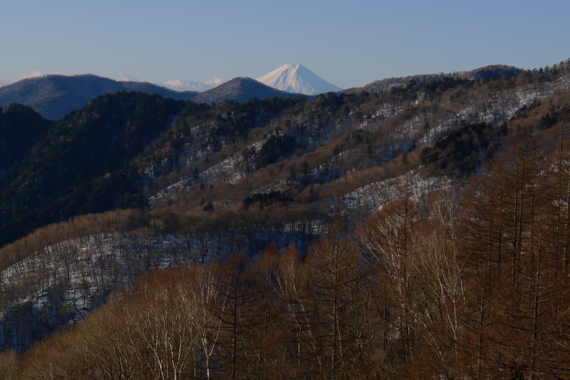 ヨコスズ尾根の中間は、南側斜面がスパッと切れ落ちていて、足を滑らすと場所によっては100m以上の滑落は必定です。過去、ここで滑落しもあったはずです。一杯水避難小屋でアイゼンを外しましたが、このところは狭いし、切れていて谷は深いし危ないな〜、慎重にと落ち葉の上を歩いていると、足払いを食らいました。落ち葉の下がボールを伏せたような氷になっていたのでした。スぺースがあればアイゼンを付けようと思っていると、登ってきた男性が、「ここは高校山岳部の顧問の先生が滑落して亡くなったところだし、この先も滑るので気を付けて下さい。」と注意してくれます。そんなわけで、アイゼンはかなり下まで付けて下山しましたが、いつまでも登山道は凍っているので、特に下りは注意が必要です。