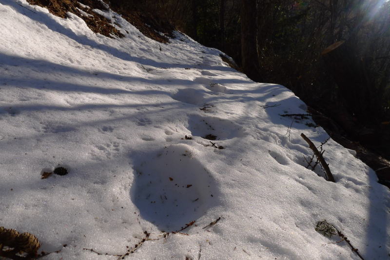陽がすっかり登ったので出発することにします。長沢背稜に出ると、一杯水方向の雪の上に踏み跡はありません。すると間もなく熊(ツキノワグマ)の足跡があります。そしてそのうちに熊の足跡はどんどん増えて、しっかりした踏み跡になっています。しかし、それも矢岳への分岐手前で小川谷の方向に下りて行ってしまって、その先は鹿と野兎の足跡だけになります。