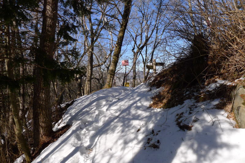 登山道は日陰では雪が積もっていますが、日中、陽が当たるところは斑になります。その分、凍っていたり落ち葉で隠れているところがあったりと、谷が落ち込んでいるところでは危険極まりありません。当初、アイゼンは軽アイゼンにしようかとも思っていたのですが、それ以外には10本歯のアイゼンしか持っておらず、念のため10本歯のアイゼンも用意してきたので、これを装着して歩いたのですが、一度こけそうになって体制を戻す時にゴアのスパッツを切り裂いてしまいました。