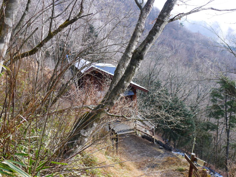 この小屋の水場は、11月23日までに排水升が取り替えられ、配水管交換の工事が終わりました。ただ、水の流れが変わったのか、昨日はほんのわずか、ポタン、ポッタンとしか流れず、水が溜まるのを待っていると風邪を引きそうでした。しかし今朝は、未明から流れがわずかに回復し、安堵です。(予断を許しませんので、ご心配の向きには水の担ぎ上げをお勧めします。なお、これまで流れていた旧酉谷山小屋から酉谷山避難小屋の間の斜面から出ていた水も、タワ尾根分岐から酉谷山避難小屋方向に進んだところの背稜下部の斜面の水も止まっています。)