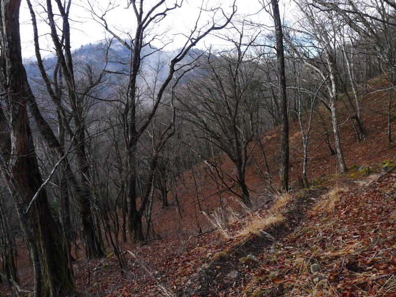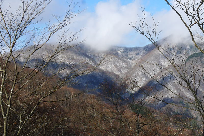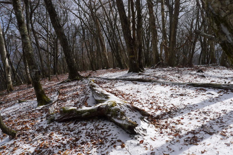 大京ノコルを過ぎて尾根に乗っかると、馬酔木が密集している尾根で男女2人と交差し、先頭を歩いていた女性に「どちらへ」と声をかけします。明るい笑顔で答えてくれた方がPIPPIさんだったことは、下山してから分かったのでした。ウトウノ頭を進んで篶坂ノ丸手前で登ってくる単独の男性に会ったころ、急に風が出てきて雪となりました。落ち葉が飛ばされどれがタワ尾根の正道なのか分からなくなり、いつもの尾根を右に分ける地点で方向を定め斜面を下りたはずが、いつもと違う景色の大きな岩が目の前に出てきたことでロートを見失ったことに気付きます。そこでGPSで現在地を確かめると少し手前の斜面を曲がって下りたことが分かりましたが、雪は次第に吹雪となってきたのでレインウェアーの上を着用し手袋も冬用のゴアテックスの物をはめます。