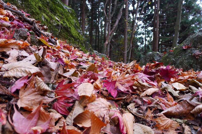 いつものように東日原に車を停め、一石神社から急坂を登ります。しばらく登ってベンチで一休みし一石山への尾根にのってからは緩斜面となり、ミズナラの巨樹への看板が見えたら直登し、巨樹を右手下に見ながらタワ尾根に乗ります。どんどん登って行って、もうすぐで金袋山というところで東京都水道局の巡視道が交差すると、その巡視道を小川谷に向け下りていきます。思いのほか東日原の方向に戻る様にしてようやく、どうにか上段歩道に合わさります。上段歩道に合わさると左に進路をとるのですが、すぐ先の崩壊斜面(法面)の工事は終わり、モノレール軌道も撤去されたようです。